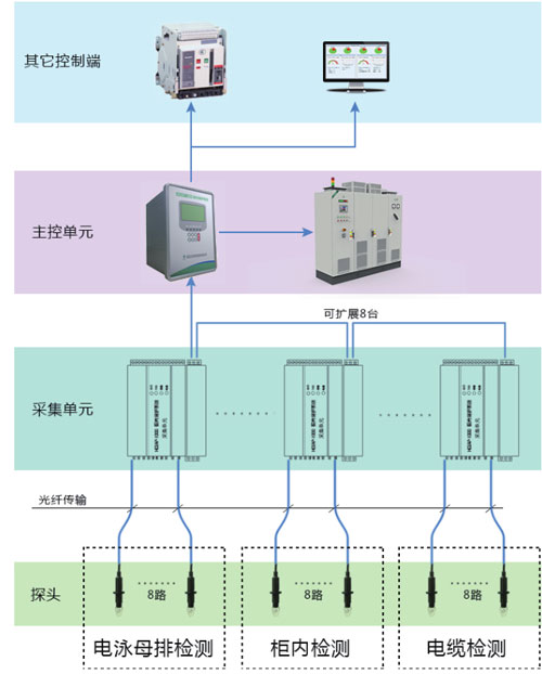 一個(gè)主控單元能同時(shí)保護(hù)幾個(gè)檢測區(qū)域,因此弧光微機(jī)監(jiān)控系統(tǒng)的采集單元可以分散到不同的位置,把檢測到的弧光信號傳送到主控單元。